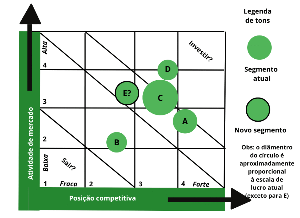 A posição do segmento no gráfico reflete tanto sua posição competitiva (ao longo do eixo x) quanto sua atratividade no mercado (ao longo do eixo y). O tamanho de cada círculo deve ser mais ou menos proporcional à contribuição do segmento para o lucro operacional.