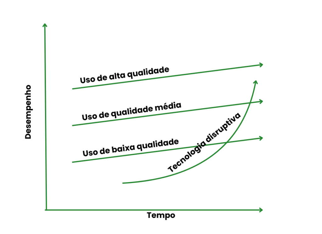 Uma tecnologia disruptiva é a que altera radicalmente o algoritmo benefício/preço. Geralmente, ela cria um produto de qualidade ou desempenho nitidamente inferior (embora muitas vezes menor, mais simples e/ou mais conveniente, pelo menos no curto prazo, mas há um preço tão baixo que os clientes existentes repensam a lógica de compra do produto e clientes novos são atraídos para o mercado).
