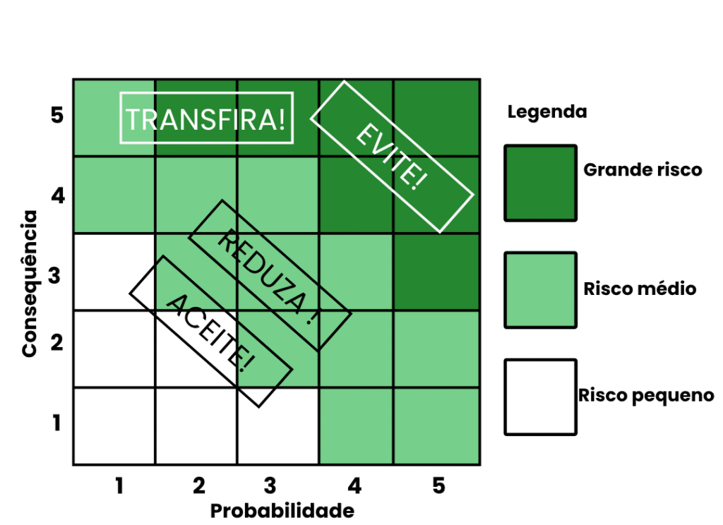 Os grandes riscos, definidos como pelo menos prováveis (4) e de alto impacto (5) ou, muito prováveis (5) e de médio/alto impacto (4) levar, são eventos capazes de interromper suas ações se forem riscos de mercado contra os quais há pouco o que fazer. Você deve se afastar desse mercado.