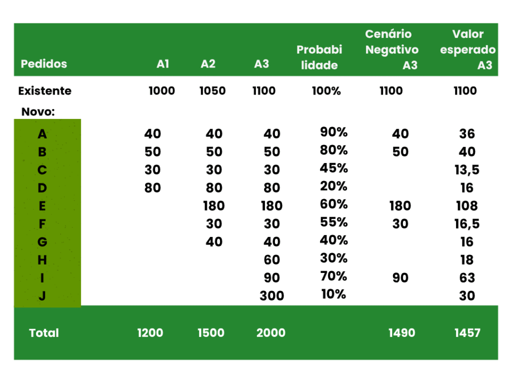 Uma forma frequente para fazer a previsão de pedidos futuros seria considerar cenários diferentes – um cenário negativo, no qual somente os pedidos mais prováveis chegam, e um positivo, no qual todos os pedidos são fechados. O cenário – base, então, dividiria a diferença.