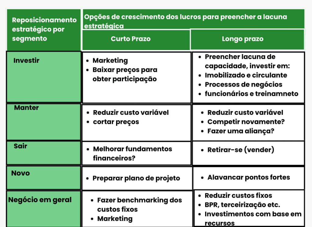 Finalmente, você precisa diferenciar as possíveis ações para aumentar o lucro no curto prazo (nos próximos 12 meses) e aquelas que irão melhorar a posição estratégica e aumentar os lucros no longo prazo.